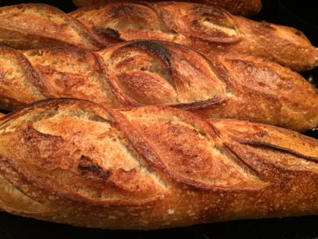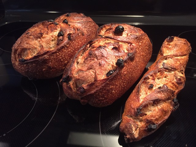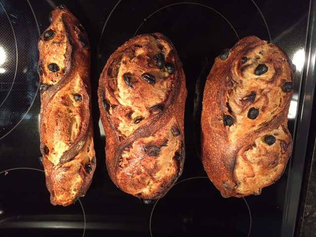 A pair of Raisin-Pecan WW Levain Batards, plus one little baguette just because...
