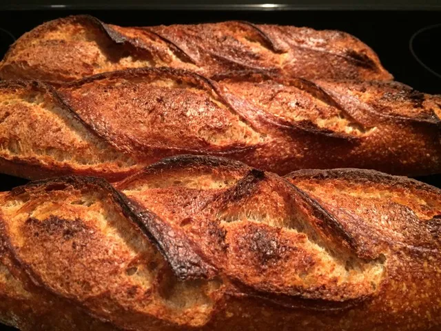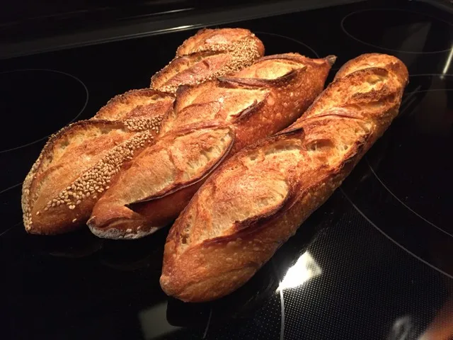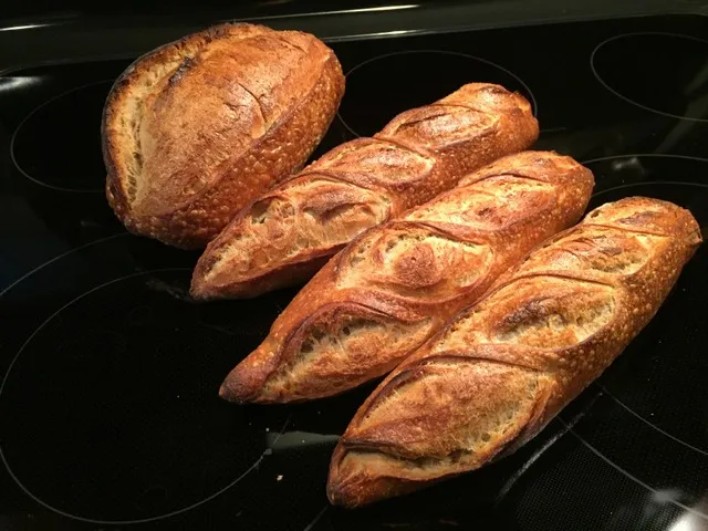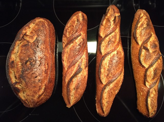 Jeffrey Hamelman's pain au levain with mixed sourdough starters. I've made this before as both baguettes and batards. So this is nothing new now, although it has still only been a small handful of bakes so far. I like the concept of the two starters, one stiff and one quite liquid. As much for an interesting change of pace as well as the process.