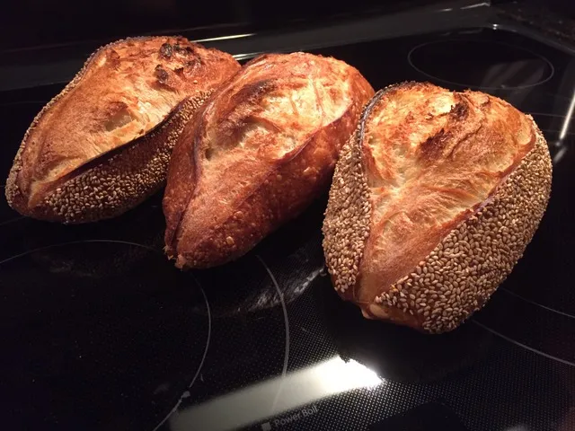 Yeah, I know. I've posted my version of these SJSD's before. But I have a new oven (again). I recently posted my first two bakes with the new oven, the Tartine Country Bread done up as baguettes. I was a bit perplexed as to how long the baguettes took to bake: 32 minutes at 300g each. Way too long in my book. And I wondered whether it was the oven, or me or the dough, or or or... So I needed to return to a reliable workhorse for a comparison bake.