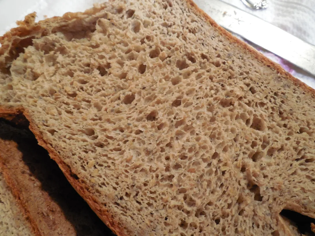 This experiment worked out very well. It's an everyday bread that I'll be using. It has no egg, only milk, and is suitably simple to use even if you're retired and aren't up for a kneading session. Most Celiac diagnoses happen after mid-life, so my series is meant to empower everyone to make their own bread, even if they're limited in mobility. My focus is on nutrition and simplicity. Please comment and tell me what you think. There is more detail in the article I'm linking to, but the recipe is reprinted here with a picture of the crumb.