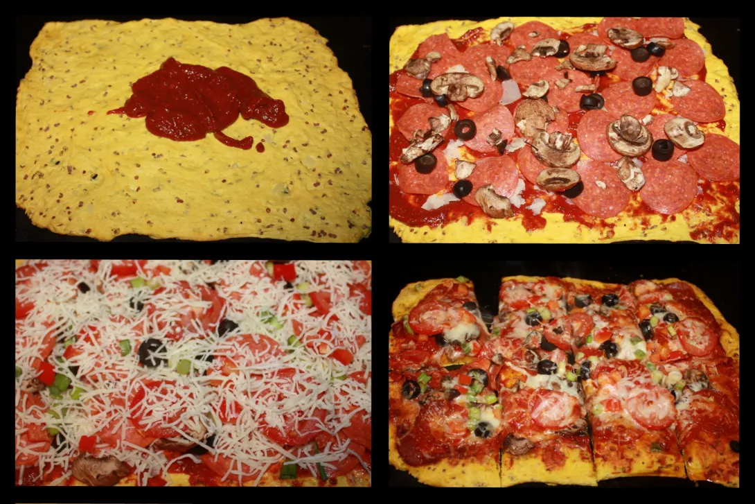 Toppings: Pepperoni, mushrooms, black olives, sweet red peppers, green onions, sliced tomatoes and a shredded Italian Blend cheese.