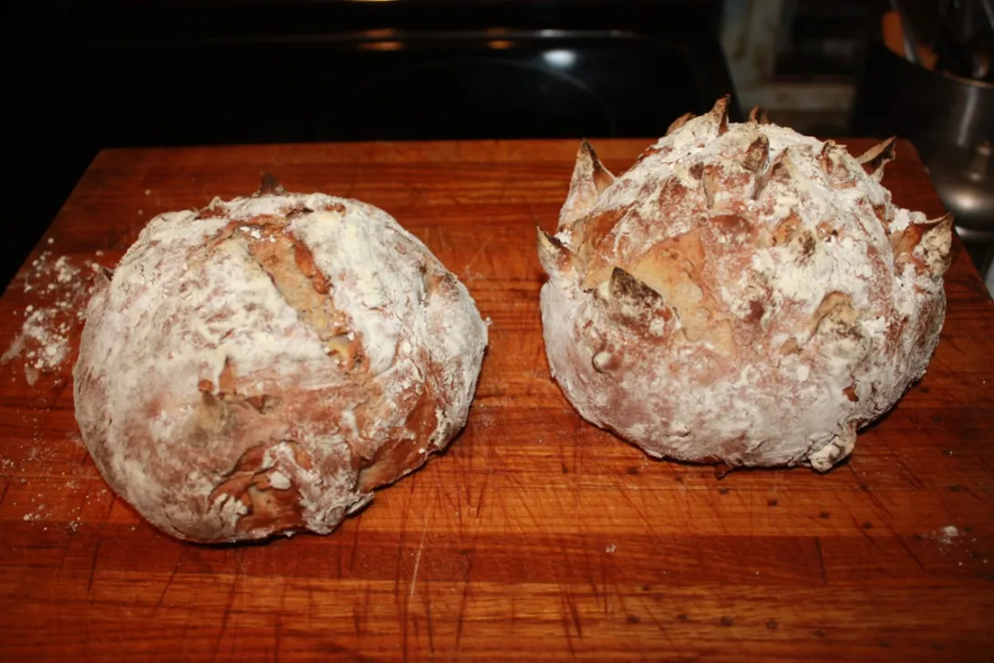 What I'm looking for is some small loaves that would be the perfect size for two people at a single meal. This is my first attempt. I also want to develop a scoring method that results in a loaf that looks like a flower (the one on the right). These are straight out of the oven and on their way to the cooling rack.