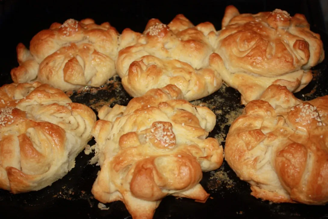 I was trying for croissants, ended up with butter everywhere, divided the dough into six pieces, tried to roll it into a ball, shaped it with an apple corer, gave each an egg bath and sprinkled sesame seed in the center. Looks like crap but tastes absolutely wonderful!