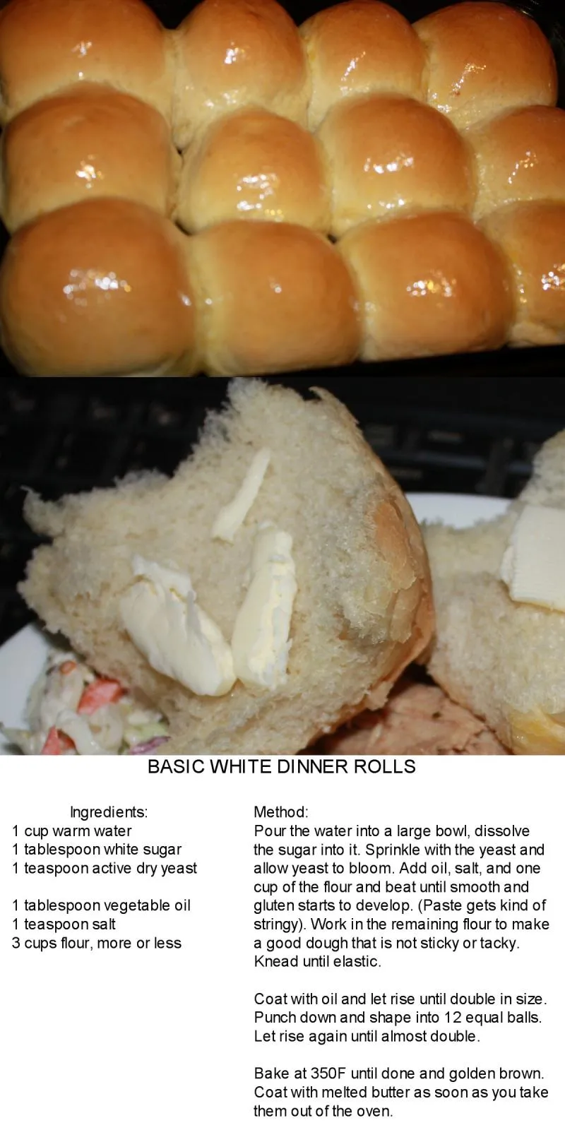 The recipe included with these dinner rolls, is my most dependable basic white bread recipe. This will make one regular loaf of bread, or a dozen good size rolls. It shapes well too.