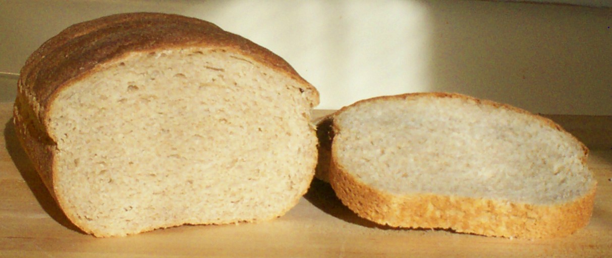 This loaf was made with Gold Medal white whole wheat flour. It was baked in an oversize loaf pan (10"x 5") with the final baked weight at 2 pounds. The dough was quite slack (78% absorption). In the past, I have had less oven spring with stone ground flour (being fairly coarse in nature), but lately the volume has improved. Re-mix time has been reduced to 3minutes 45 seconds, with good results. And the flavor of the stone ground flour is superior to fine ground (in my opinion).