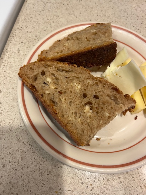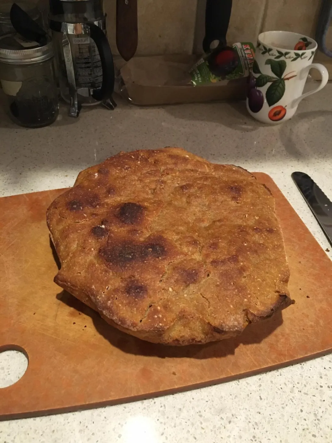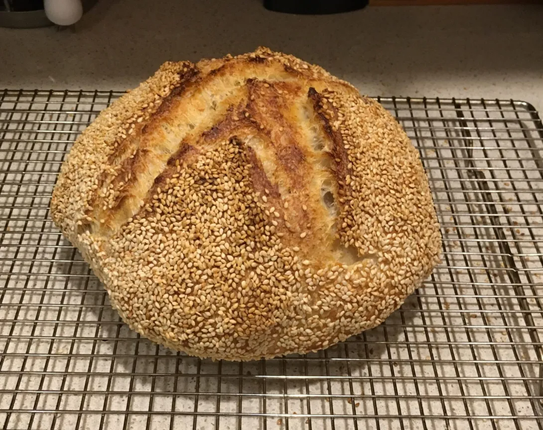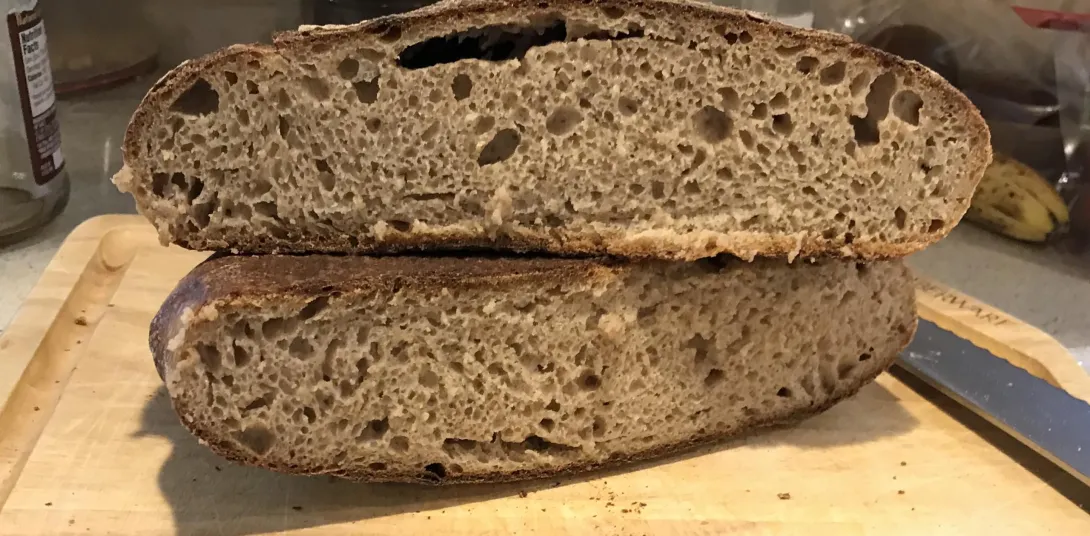 I just made this bread for a Halloween party. It is not pumpkin flavored; it is a 50% whole wheat loaf, using the recipe by Maurizio Leo from his book, “The Perfect Loaf,” p.153. I pretty much followed his recipe using bread flour annd whole wheat flour and 2 grams of vital wheat gluten. I made the levain the day before and refrigerated it overnight to use the next day for baking. Leo likes to do a short levain fermentation on the same day of baking, but I prefer the method that I used. The bulk fermentation took about 5.25 hours in the proofer at 78°F.