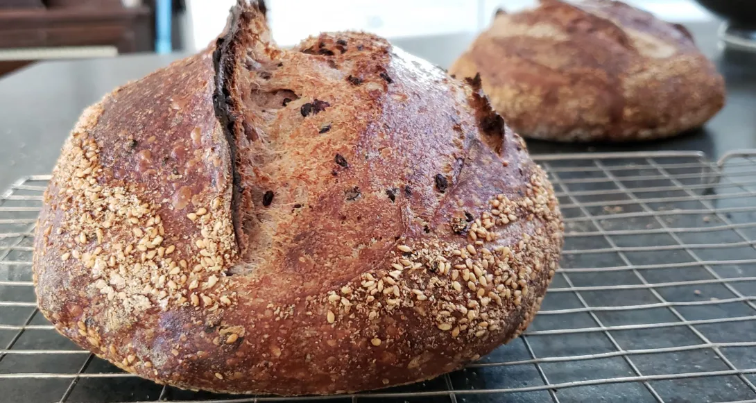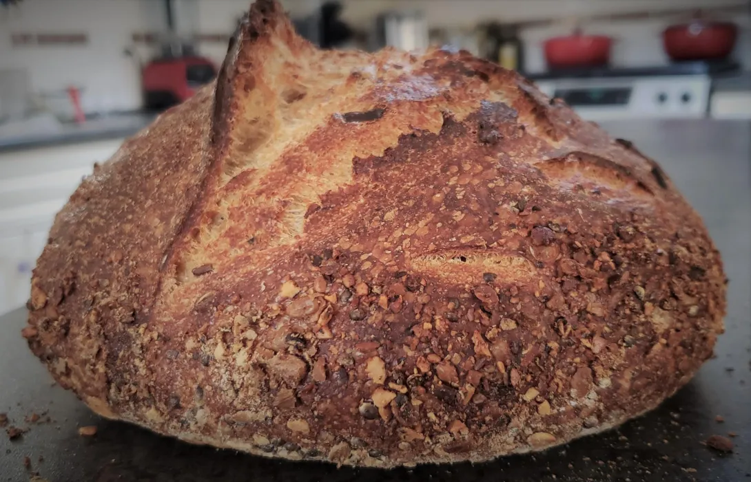 This is today's daily bread...made with rolled oats fermented overnight with levain and water before being mixed into a rye/spelt/Marquis wheat dough along with some chopped almonds; shaped loaves were dusted with sifted bran and some sesame seeds, cold proofed overnight and baked this morning direct from the fridge in pre-heated DOs.