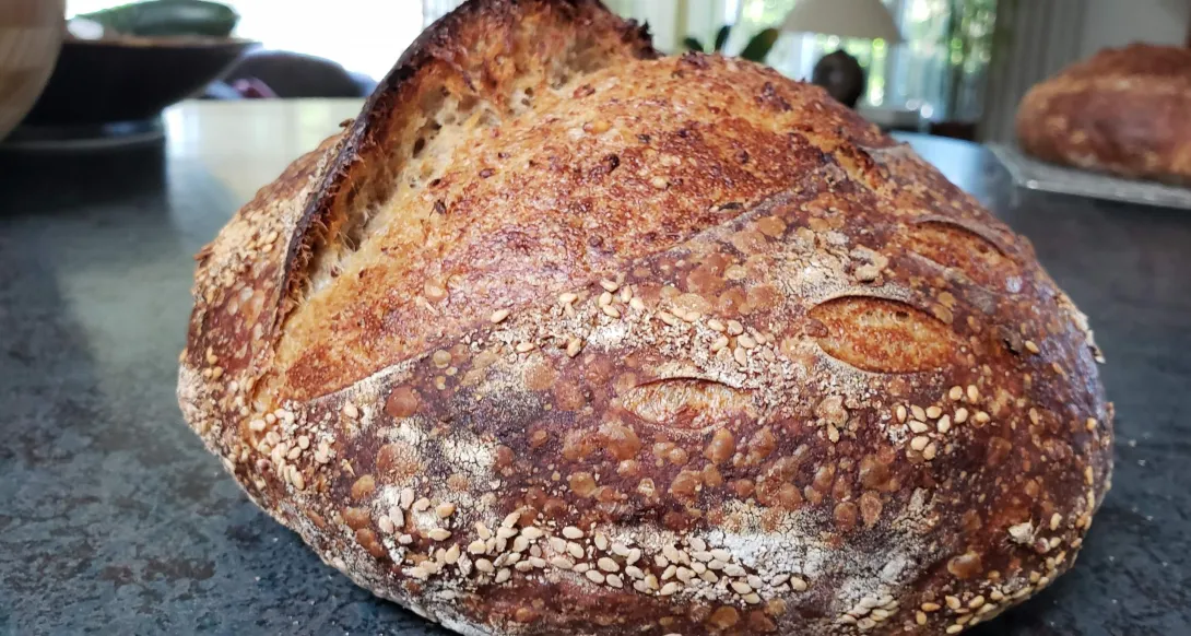 I was thinking about grass a few days ago while finishing the last lawn mowing of the season and while not really appreciating my lawn grass as such, was struck by the fact that wild grasses are the archetype for the many grains we use to make our bread. Many species/strains of wheat and other grains can trace their origins as wild grasses that have been cultivated, modified and preserved over many years as food crops. So, with that in mind, I baked what I decided to call "Grass Bread", as inspired by the grass roots of our modern grains.