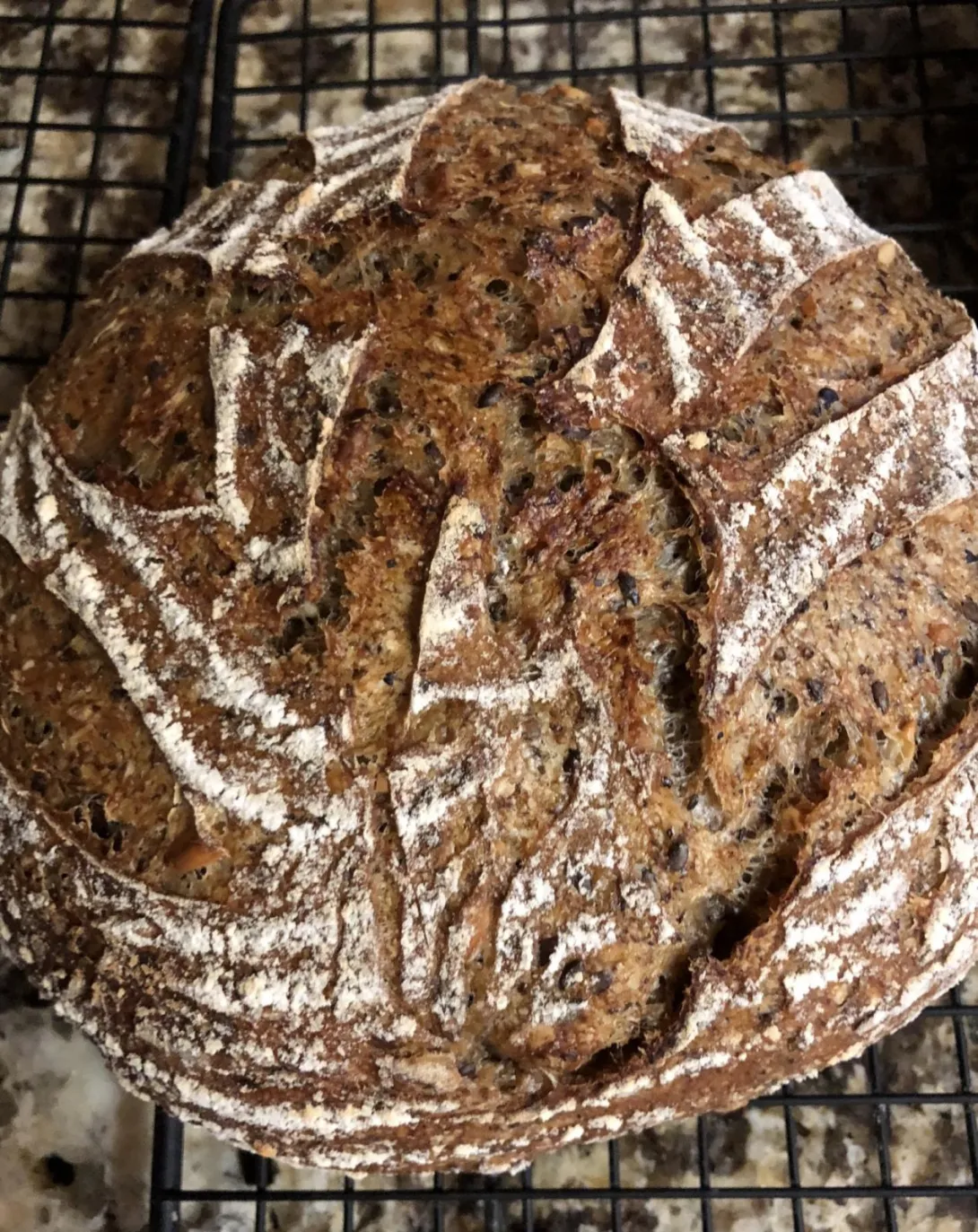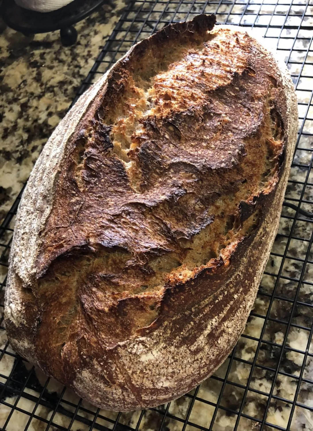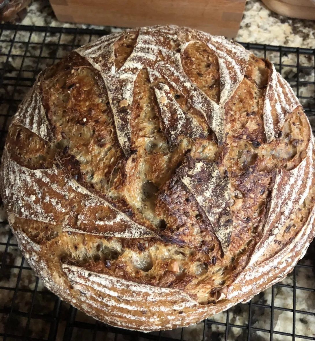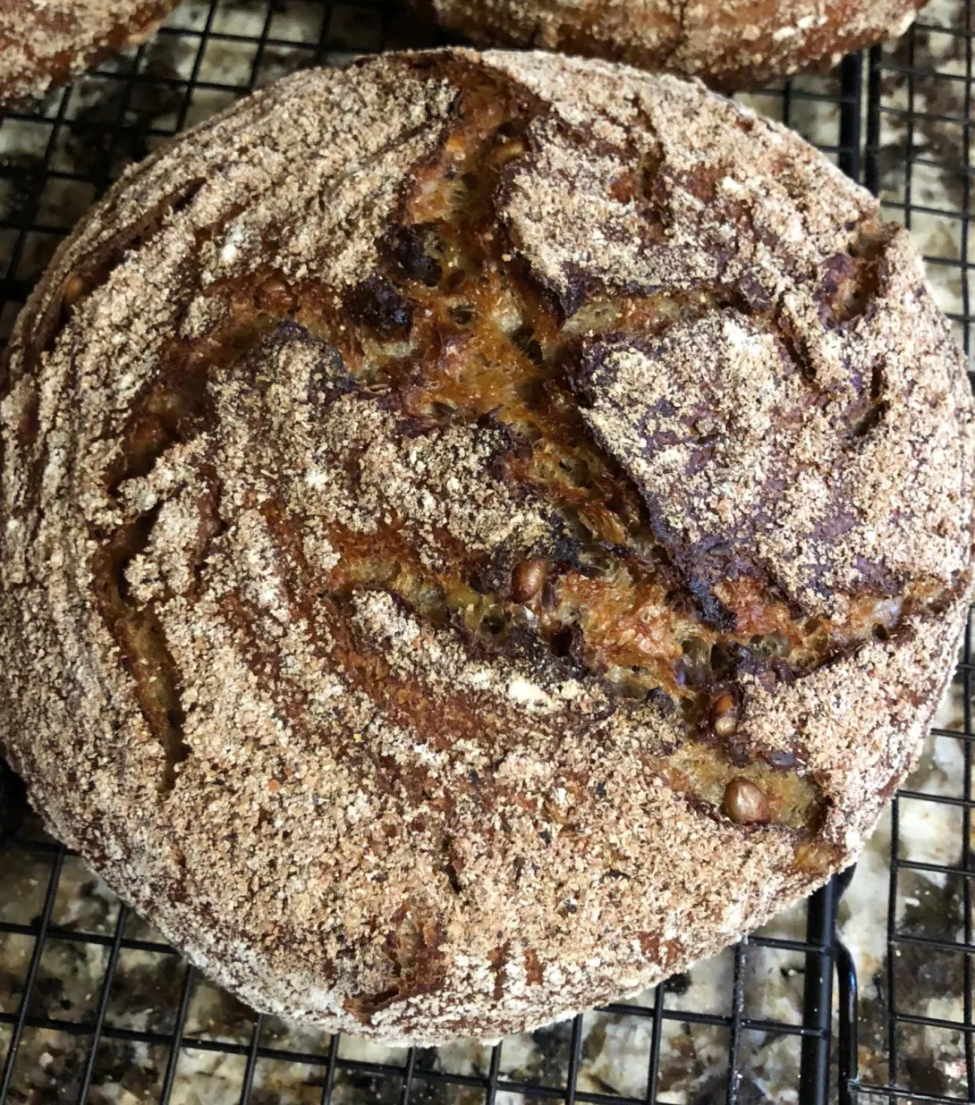 This is a repeat of Trevor’s European Peasant Bread (with the substitution of Kamut instead of wholewheat) while implementing Dabrownman’s suggestions: “I would do three different things with the levain build. I would first get the starter amount up to 15 g from 10g. Then get all the bran into the first feeding of the levain all 35g so it is in the acid the max amount of time and go to a 2 stage levain build with the first stage being 4 hours and the 2nd stage 8 hours. Then I would use the high extraction flour from the whole grain for the 2nd stage of the levain rather th