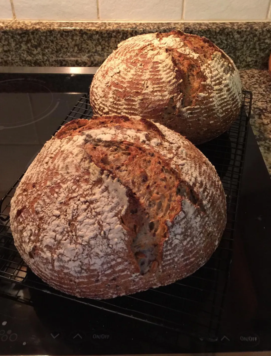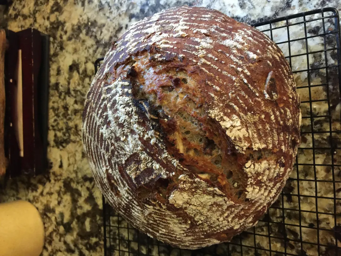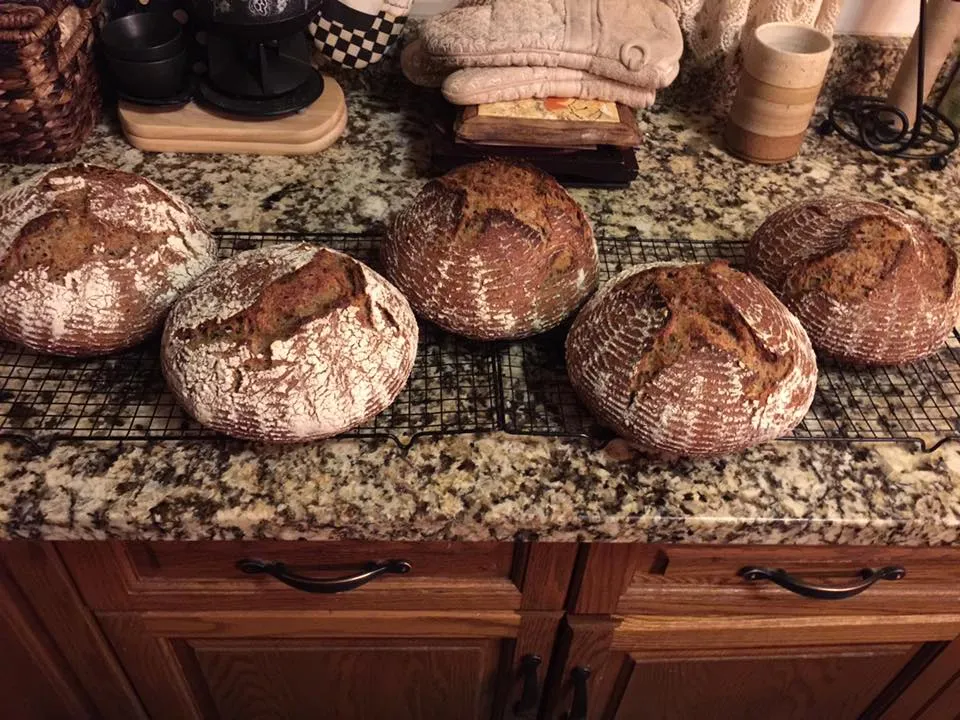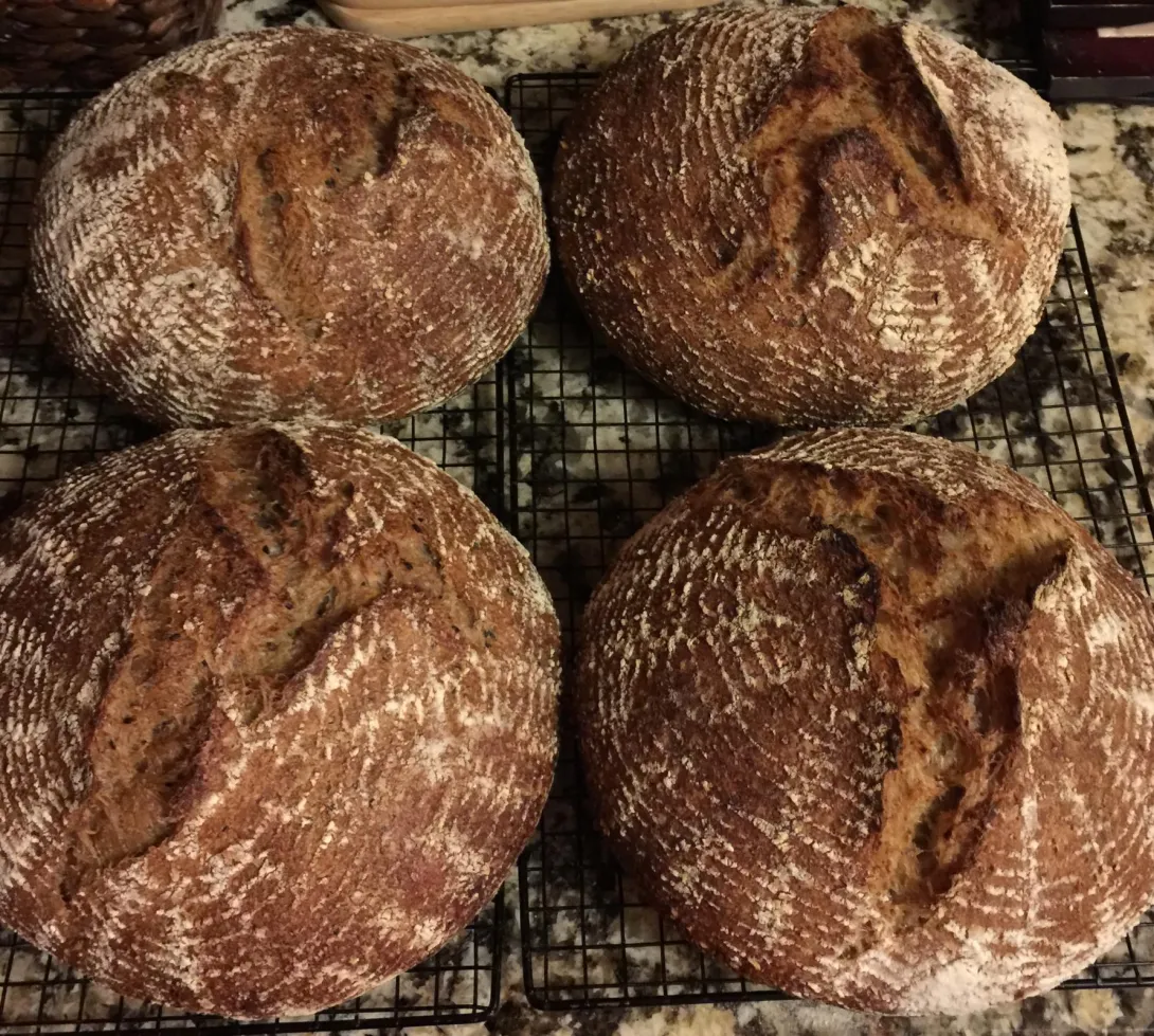 This week I decided to go back to my roots in bread baking by baking the Overnight Country Brown recipe out of FWSY. Of course, I had to put in a few add ins. Two of the loaves got a total of 100 g of bulgur soaked in 100 g of water and the other two got 100 g of sprouted amaranth (24 hours) and 25 g of black sesame seeds. I added the add ins at the autolyse stage but otherwise followed the recipe as written in the book.