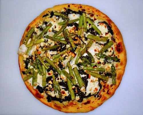 Tonight's dinner was a white sauce pizza. Mornay sauce made with Peccorino Romano, fresh Mozzerella, Baby Spinach sauteed in garlic-infused olive oil and balsamic vinegar, fresh asparagus tossed with garlic-infused olive oil and tarragon, and Feta cheese.