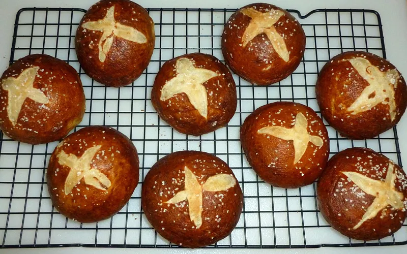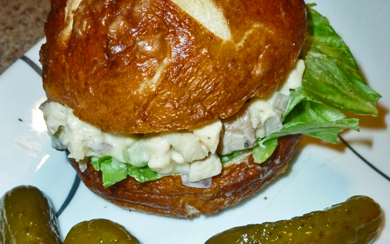 The recipes for both the Pretzel Sandwich Buns and Maple Mustard Chicken Salad appear in the August 2013 King Arthur catalog. The easy to make buns are soft and taste like soft pretzels; the chicken salad is delicious. I roasted one chicken breast and two thighs (both boneless) at 325°F for the meat.