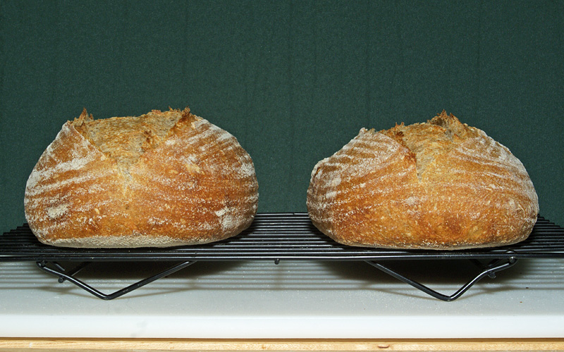 Yesterday I baked two sourdough boules; it's become a weekly chore. Sourdough has all but replaced our pre-starter days' bread machine whole wheat or white sandwich loaf dough. Two loaves, with a baguette or two, and occasionally Jewish Rye keeps the two of us well stocked for a week to ten days.