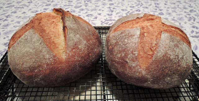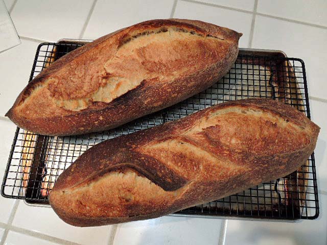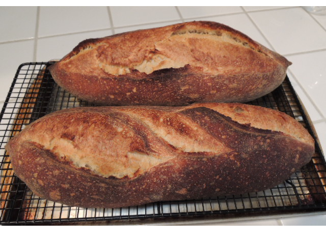 A couple days ago, my wife pointedly remarked that there were only two baguettes left in the freezer. This was a fair warning, so I built up a liquid levain and made a batch of SJ SD dough. This afternoon, I divided, pre-shaped, proofed, slashed and loaded 4 baguettes in the oven. The timing was perfect to have them out of the oven in time to get to the farmer's market when it opened and then to enjoy fresh-baked baguette with dinner.