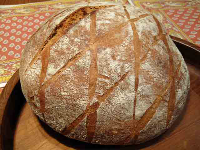 One of the breads we baked at the SFBI Artisan II Workshop last month was a miche. Everyone thought it was one of the best breads we baked. I made it at home for the first time two weeks ago, but used “Organic Type 85” high-extraction flour from Central Milling rather than the mix of white and whole wheat with the addition of toasted wheat germ we had used at SFBI. (See This miche is a hit!)