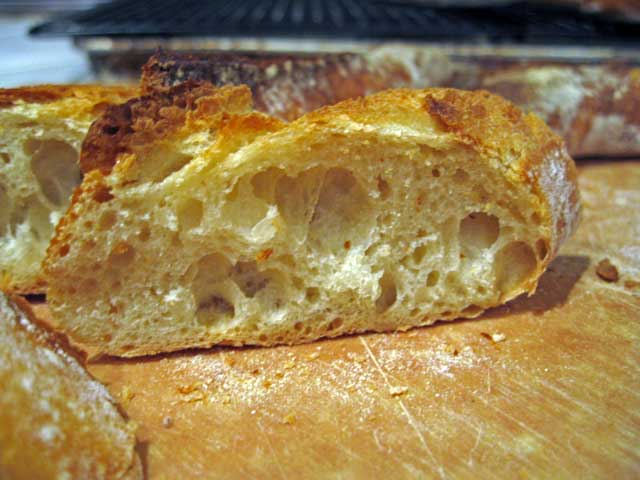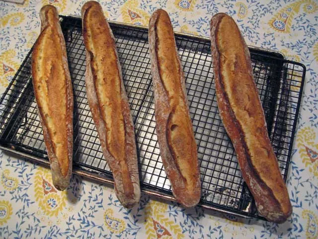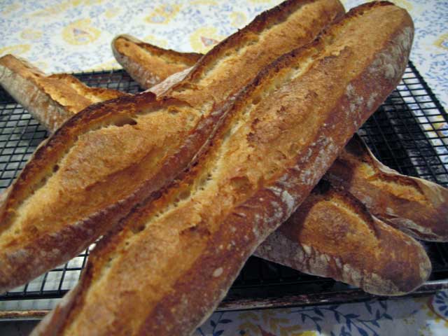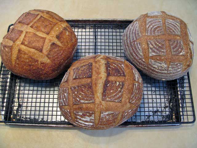 Above are pictured three loaves of San Francisco Sourdough made from the recipe in Peter Reinhart's "Crust and Crumb." They each turned out with subtle differences that are instructive regarding the variables that affect the appearance of our loaves. I thought it might be useful to describe these differences and what produced them.