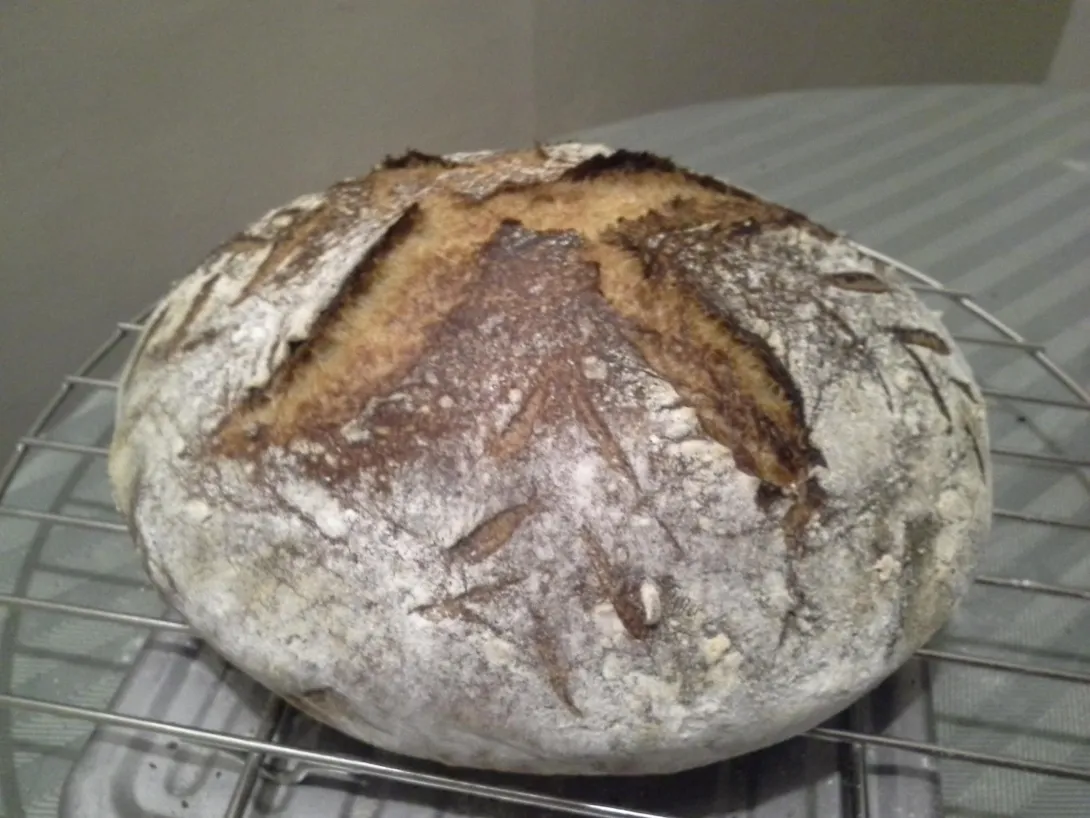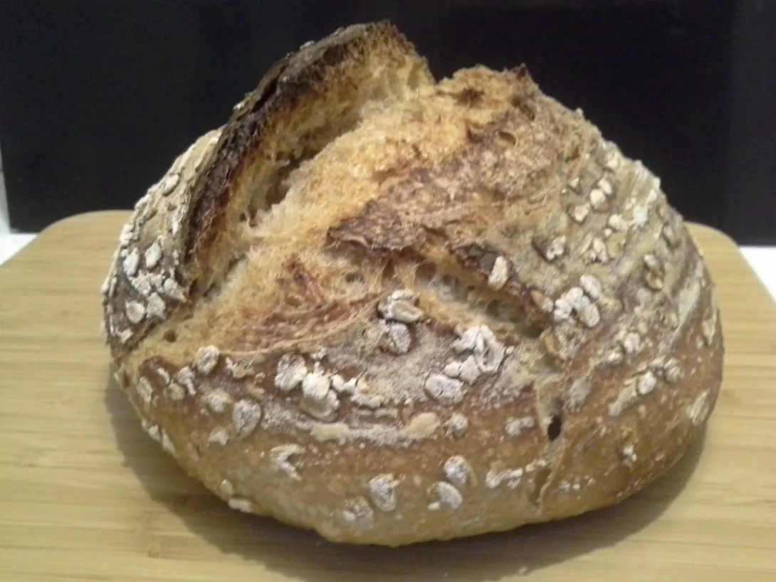 2 hr Bulk Fermentation;Overnight retard ref; 30min shaping and rest; 2hr proofing; 240C dutch oven 20min, 25 mi