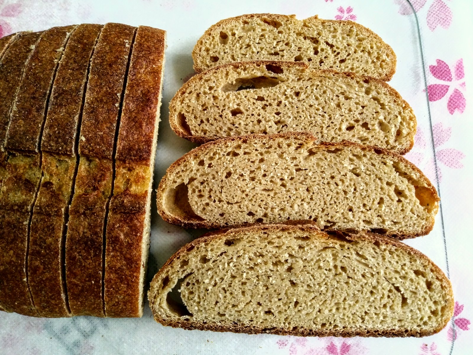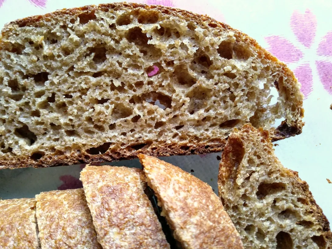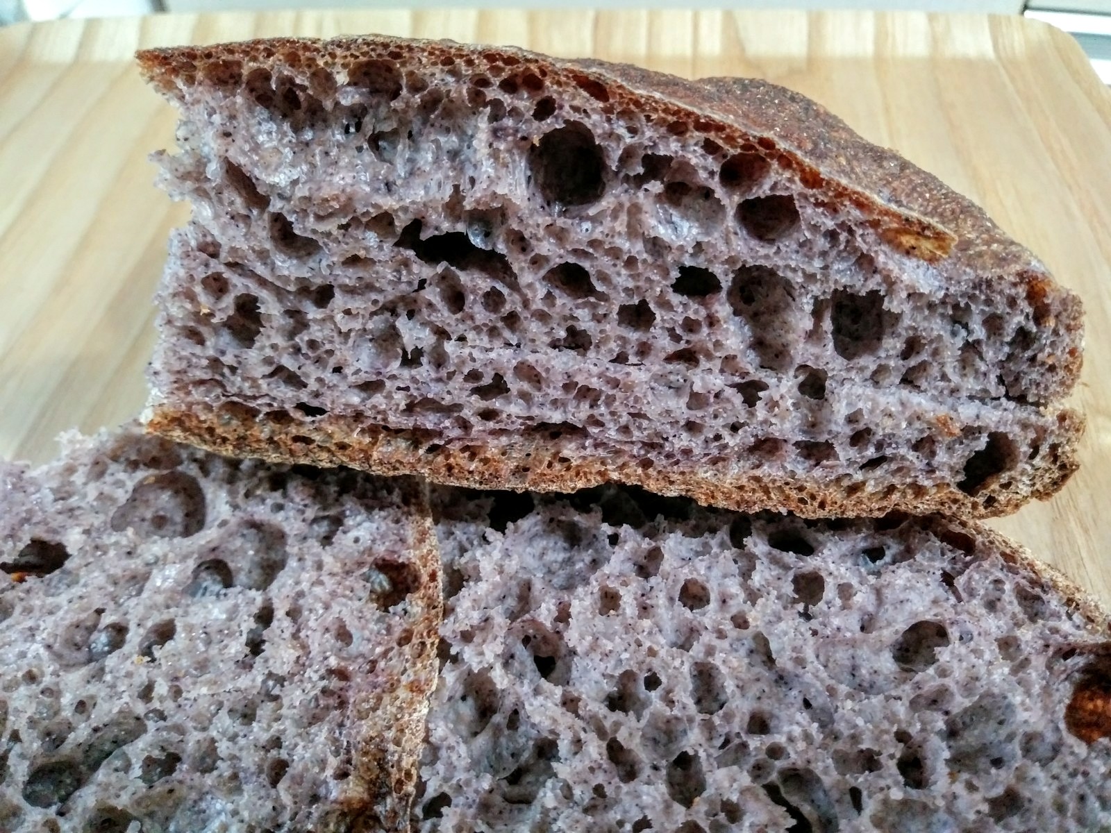 Since I started working with white dough, I’ve come to recognize the importance of gluten development in bread. Whole grain dough tends to be stiffer even when fully hydrated, which gives a delusion that dough mixing is neglectable. Wrong. I was so wrong! Two rounds of 3 minute mixing and 1 set of lamination contributed enormous elasticity and extensibility. The dough felt completely different and it does show in the crumb.