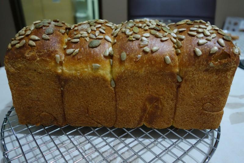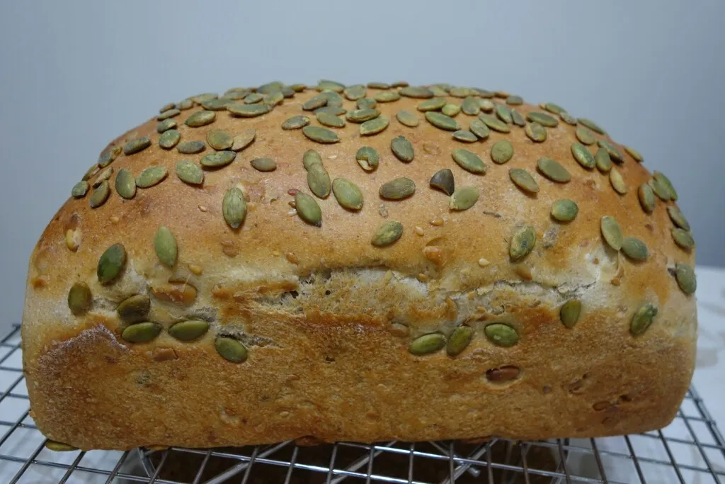 4) More pumpkin seeds were added to the top of the loaf after shaping instead of the suggested sesame seeds.