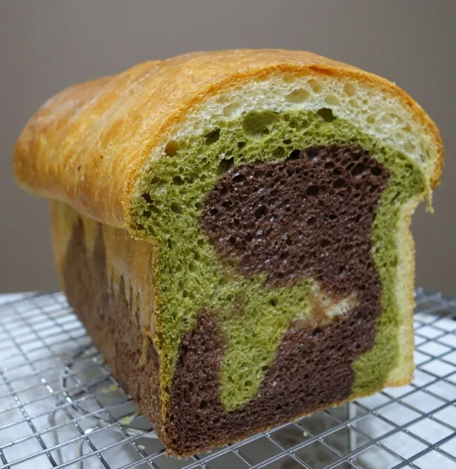 1) I divided the dough into 3 portions - original, 4% matcha powder added, 8% cocoa powder added. I shaped them into rectangles and put one layer on top of the other, then rolled them up into a log shape and placed it into a loaf tin.