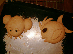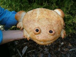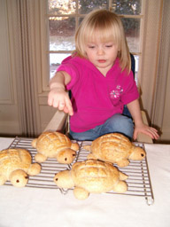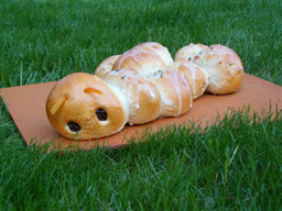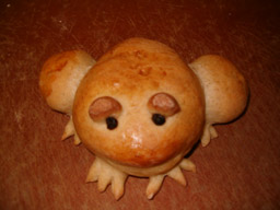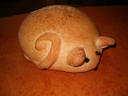 Several years ago I embarked on research and development of fun shaped buns. The doughs I use are: whole wheat, sweet roll, cheese, oatmeal, and caraway rye. For the eyes I use currants, raisins, olive slices, a date slice filled with a craisin. For fins and feet I sometimes roll out and cut pieces, other times I make a ball and cut toes in. I use an egg white for the glaze and for some designs sprinkle with sesame seeds.
