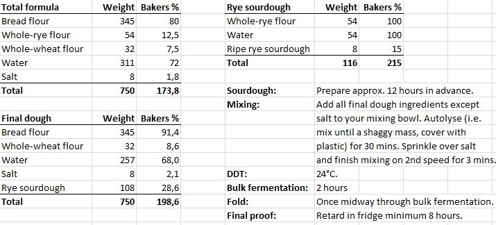 The Easter holiday is drawing to a close, but I felt not quite done with baking before holiday was up... I was also running short on bread, so yesterday evening I mixed dough for my regular sourdough bread. Basically the kind that keeps me going throughout the week. Below is a copy of the formula.
