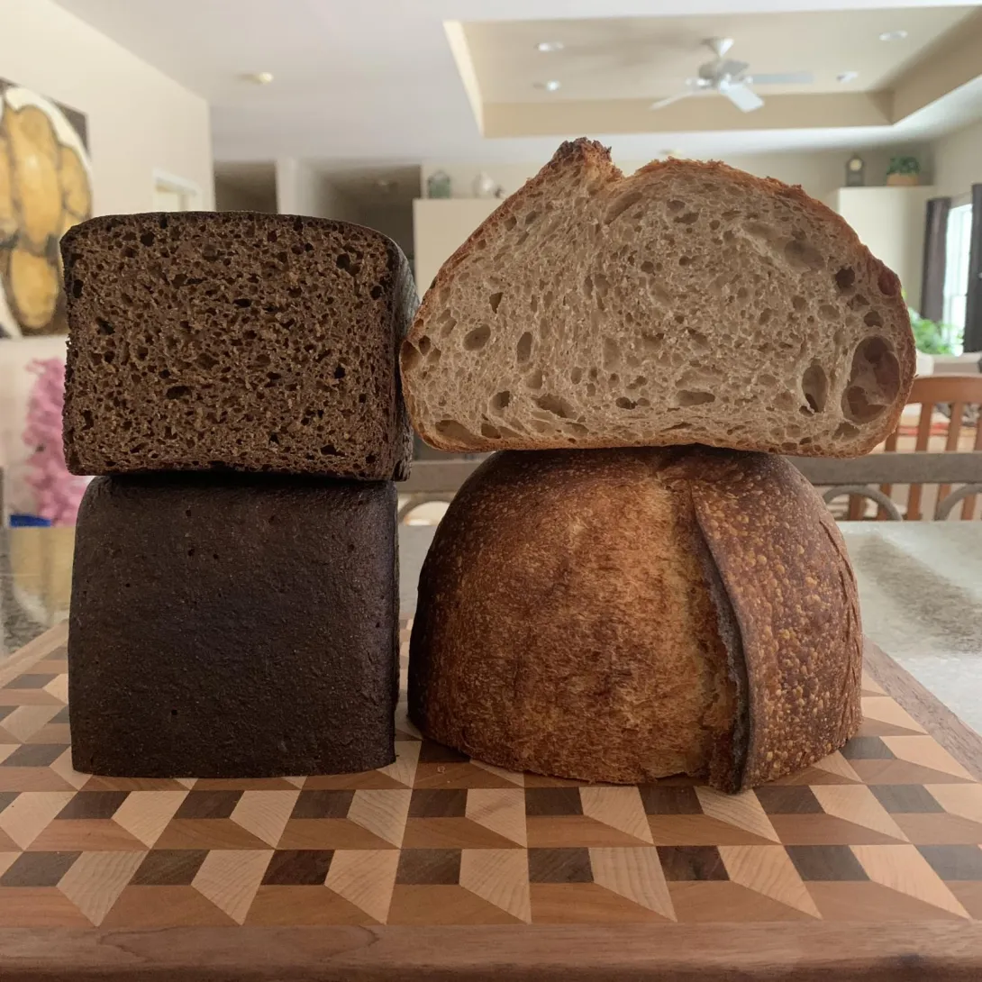 Two fun bakes this weekend... A Lithuanian Black Rye recipe that I found on IG, and my 40% Whole Grain (Emmer and Einkorn). All the whole grain flours in both breads are fresh milled using berries from Janie's Mill.