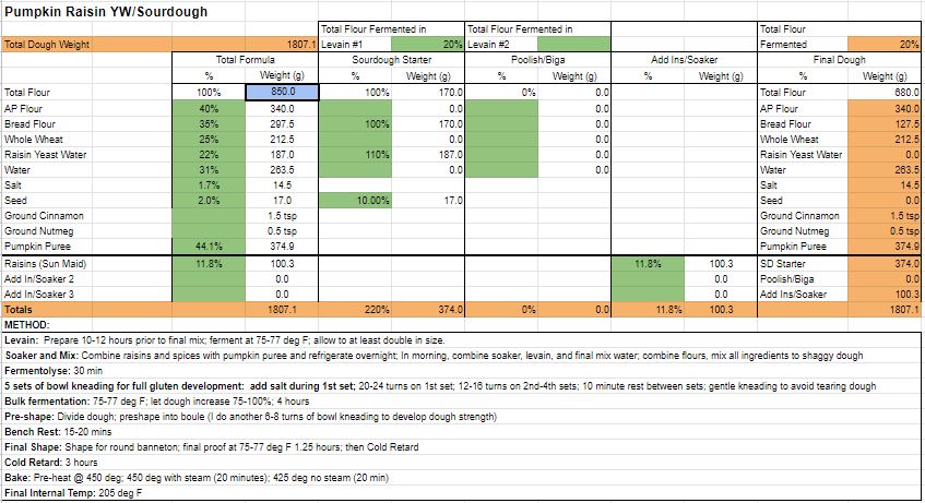 I used the recipe from wassisname as a starting point: https://weightloss-slim.fit/node/35177/pumpkin-sourdough%3C/a%3E%3C/p%3E%3Cp%3EI didn't have any pumpkin seeds handy, so I went with raisins instead and added a little cinnamon and nutmeg. Recipe below is for two loaves.