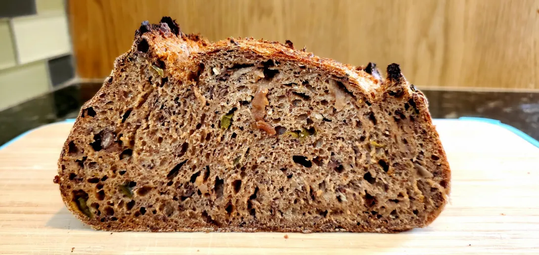 Black bean sourdough with caramelized onions and Jalapenos! (crumb shot included)
