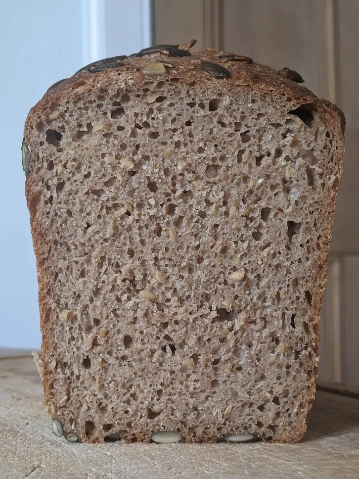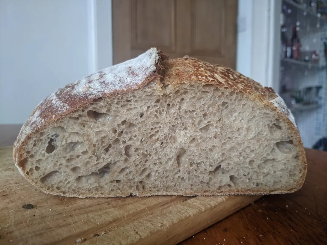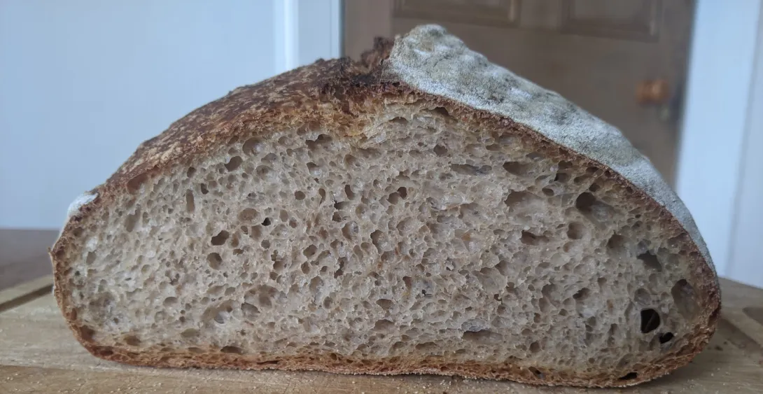 I wanted to repeat the same bake, but adjust after seeing the results. I reduced the yeast to slow down the fermentation, and reduced the hydration. Unfortunately, I accidentally overshot the temperature A LOT (I wanted around 25, but got over 30), so the fermentation was very fast even with just 1g IDY, and I only extended bulk by about 30 min. Despite lower hydration, the dough was still surprisingly slack. I wonder if it's just because it started out very warm, or CLAS doesn't strengthen the gluten like regular sourdough does, for some reason.