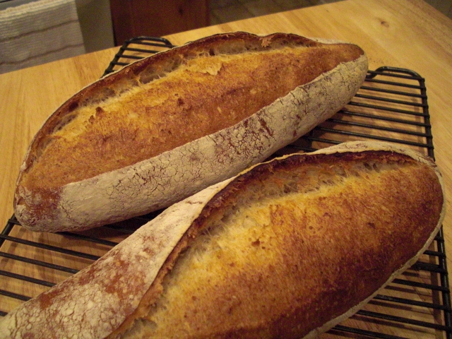 I made up another batch of dmsnyder's San Joaquin Sourdough and this is my bake. They are still singing as I type this! I got a better ear this time- I think it was a better scoring, I cut a little deeper than the last try. Also, I used the full 21 hour cold fermentation for this bake as apposed to the 14 hours on the last attempt. I don't know if this has anything to do with the better ear or not.