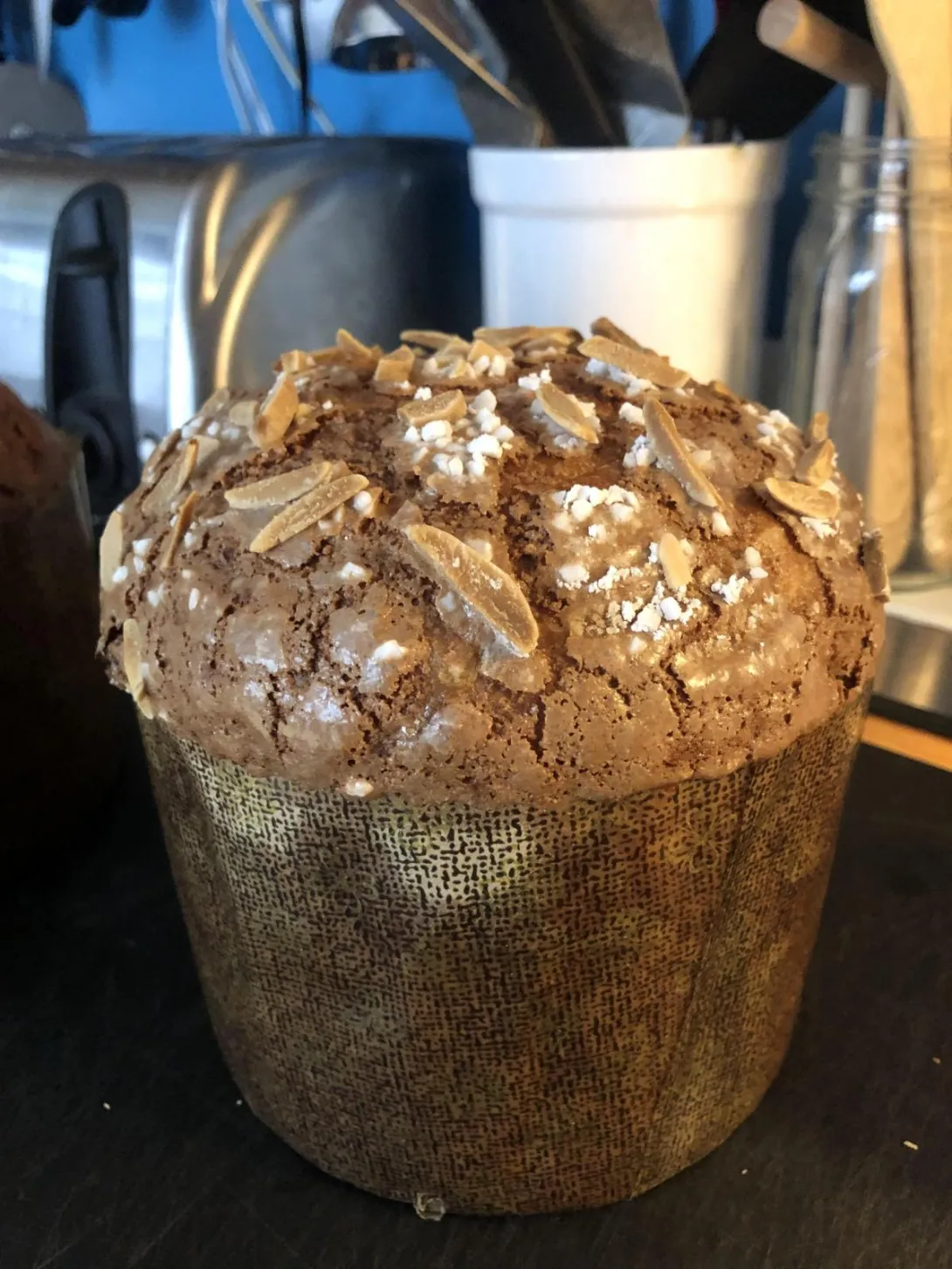 After a long hiatus, I've returned to panettone. I started training a new LM a couple weeks ago and attempted my first bake. This is a 1kilo alto, following the EIDB recipe (with a couple small modifications). I scaled the recipe a little too small and didn't account for mixing loss so I ended up with only a 950g loaf in a 1000g mold. I think I would have had more volume with 1050-1100g.