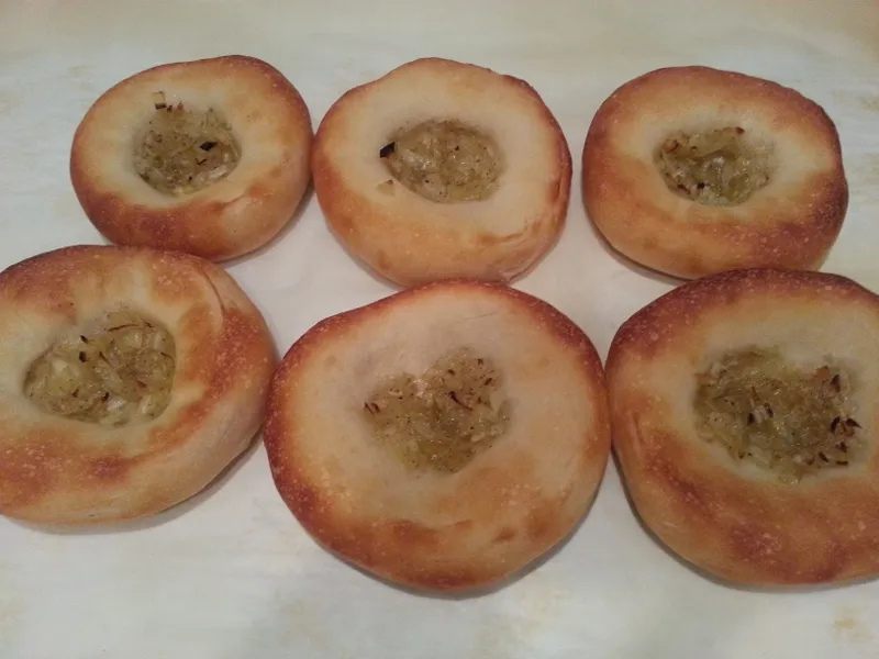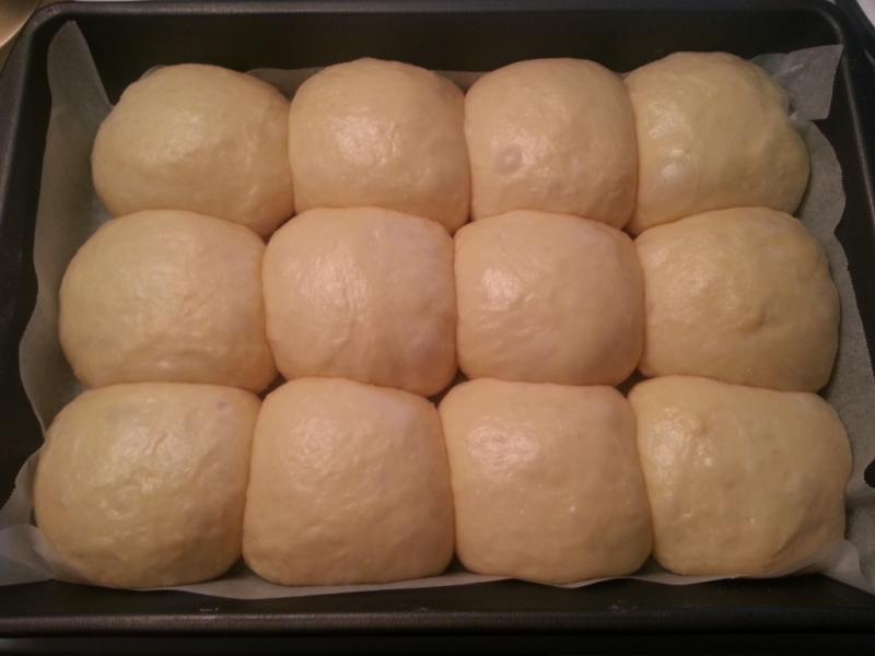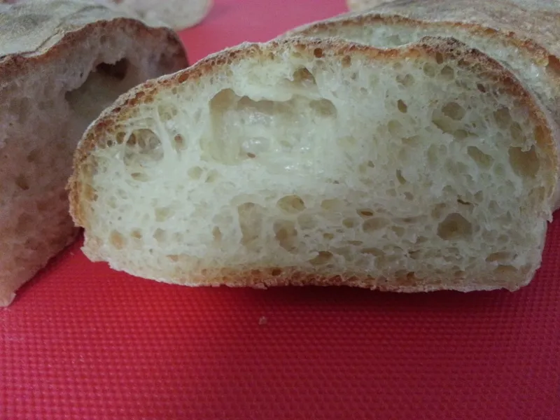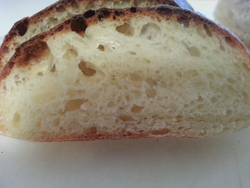 The dough rose for 8 hours at room temperature. After shaping, I let the loaves rise for 1 hour before scoring and baking for about 20 minutes at 450F. Two ice cubes provided steam.