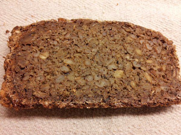 The gummy bit near the bottom tells me that something is wrong with my baking. Right now I have another Quinoa loaf in the oven, panned, on a lower heat. We'll see what happens.
