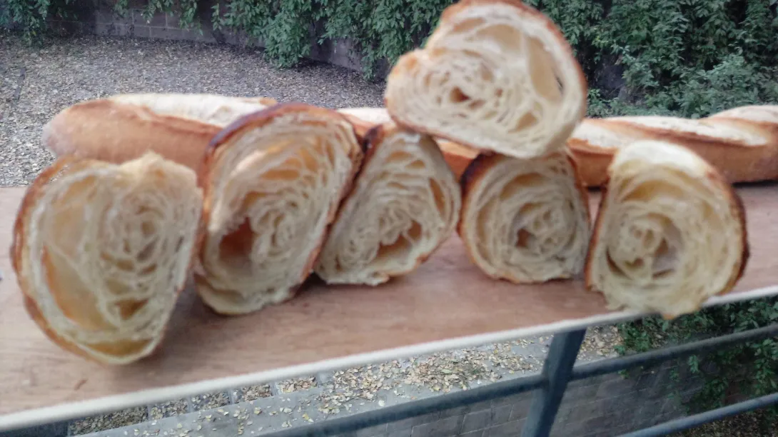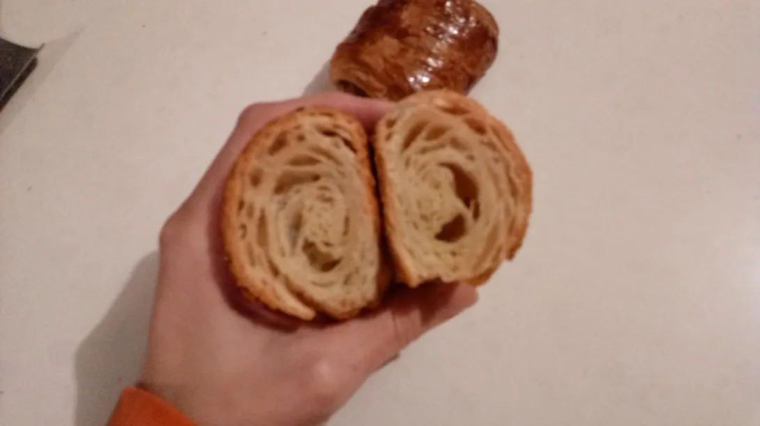 One thing you can rely on in baking is disappointments especially in the wake of progress. Last week I was ecstatic at seeing my croissants showing semblance of good structure. So going into the next bake I am sure I can improve. Take extra special care in lamination (note the profile, this is so far the nicest profile cut I have produced) but come bake time I can see but minute 2 or 3 they juat aren't getting the oomph needed to really puff the inerds - as is shown in the snapshot - dangit !