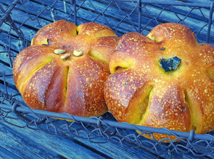 and below: my standard, pumpkin fougasse as jack, black sesame fougasse as spider net, and some pumpkin cream twist role!!