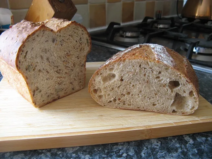Well, after having spent five days in Prague, sampling their wonderful bread (there is even fresh, home-baked sourdough multi-grain bread in the convenience stores!), I came back to my daughter's house to find no fresh bread. So off we go again. First, some more of the seed bread for toast. This also makes very good toasted egg, ham and cheese sandwiches for breakfast, especially with some of the excellent cheese I got at Neal's Yard in London Borough Market - the best cheese shop in the best market in the world! :)
