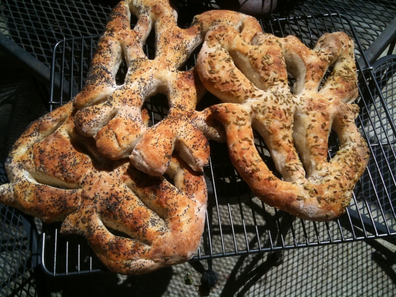 Fougasse is my favorite easy sourdough: I love the extra crust and the ease of pulling it apart. I made these with my version of Pierre Nury's and Zolablues Light rye: 65% hydration 5% rye, 20% levain (approximate) and 1.8% salt. The levain was kept in the fridge for a couple of days before I made this bread. Overnight retard following minimum stretching/folding. Rolled in poppy seeds and fennel seeds, brushed with olive oil, baked on stone 500/400 degrees F.