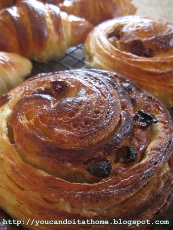 It has everything that ticks, slightly spiced juicy sultana (golden raisin), pastry cream wrapped in buttery and flaky croissant dough. Some are also glazed with apricot jam, and finished off with icing sugar.