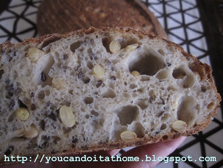 I made this same bread before some months ago combining Jeffrey Hamelman’s method and Bourke Street Bakery recipe (not entirely). This time I followed Bourke Street Bakery’s recipe closely. Umm, closely, I actually increased the amount of both soy beans and linseeds substantially (double the amount for both soys and linseeds), upped the amount of water a little (hydration percentage) and replaced 10% of bread flour with whole wheat flour.