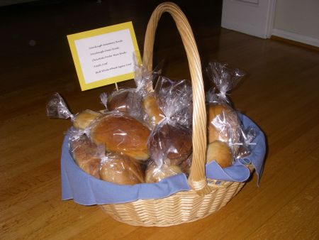 A few relatives suggested that they would love a loaf of bread as a holiday gift this year.  I took that idea and had a little fun.  When we gathered last Sunday, I brought a basket containing five different types of bread in different sizes and shapes for them to choose from.  It was very fun to share my love of baking and everyone went home with a few loaves.  Here's the basket: