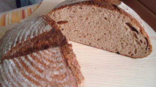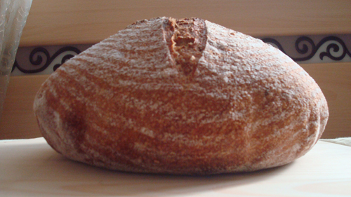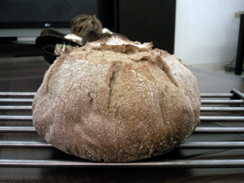 This was a 100% Wholewheat boule milled from Red hard spring (I think) Wheat. The wheat was milled too fast too fine, and i found the hard way, that finest stone milling causes starch damage. The results were as this: