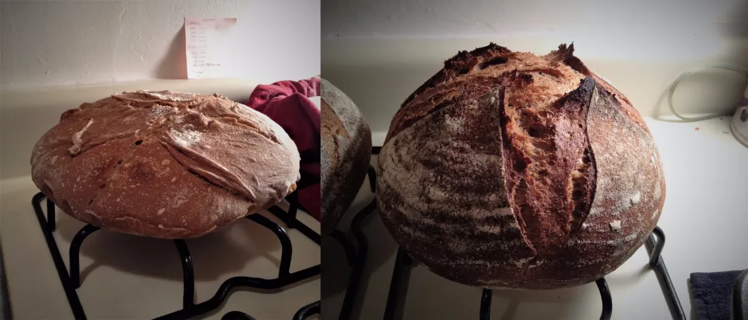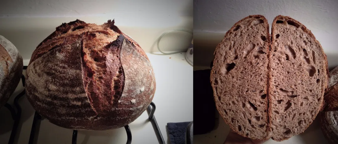 I've made exciting progress on my 100% whole grain loaf (pain integral). This particular loaf is made from home-milled whole wheat (77%) and whole rye (23%), and 85% hydration (I also dusted it with some white flour). It's been my ambition since I started to bake naturally fermented bread to make whole grain loaves like this (with good oven spring, open crumb, pleasing taste, and hardy crust). I still have a lot of improvements I want to make but I know it's just a matter of time now :)