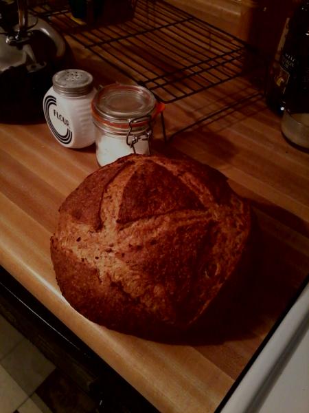 Forgive the bad photos; they were taken at 5 a.m. with my cell phone. I wanted some pictures before I devoured the stuff. This is a rustic course wheat loaf. It is easy to make, and packed full of great wheaty flavor.