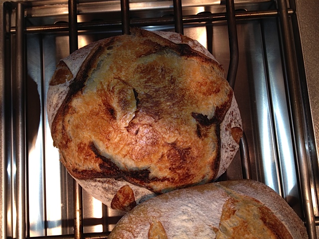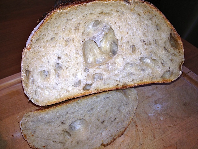 Happy with the oven spring here :) I've been struggling to get cuts I'm satisfied with the disposable razor blade on a stick idea, so I decided to find an old straight blade razor (think what a barber would have used years ago).. I found one and had much better results - I've often admired Della Fattoria's breads (rosemary lemon, in particular) and have wondered how they cut the designs in the top. I find when I use the disposable blade on the stick - the edge of the blade occasionally get's caught when I'm making a cut and tears the bread slightly.