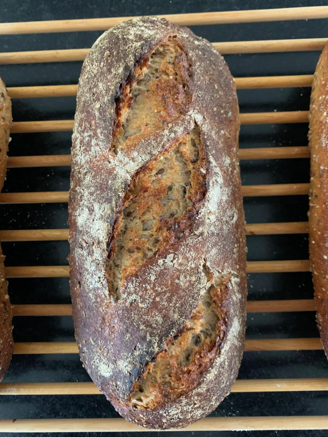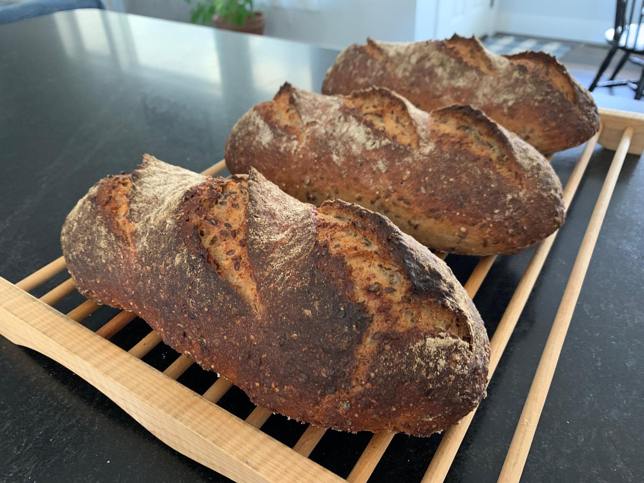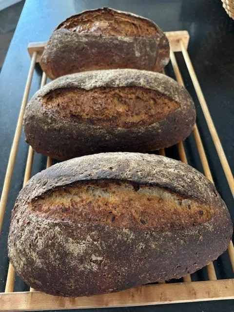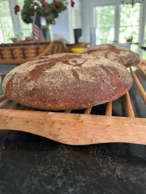 We returned home a couple of weeks ago from a trip to Myrtle Beach and needed some bread. After a bit of consideration, I opened The Rye Baker and began thumbing through it. Several breads looked appealing and I eventually selected the Milk Rye. It’s one that I haven’t made previously. The bread is about 60:40 rye:wheat (medium rye flour and bread flour). My deviations were to substitute whole rye flour that I milled in place of the medium rye flour, 2% milk for the whole milk, and ADY for the IDY.