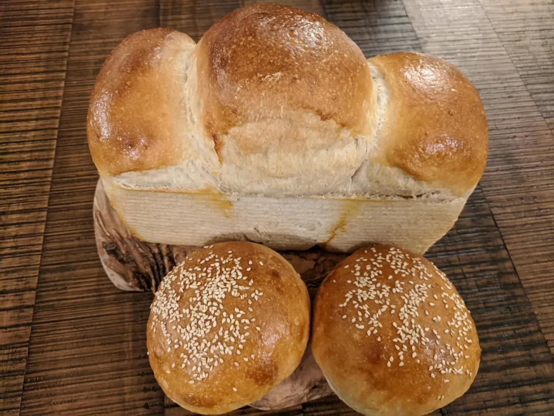 I had not made Hokkaido-style dough for some time. For the fluffyness of it, I decided to have a run yesterday and was pretty happy with the rise and softness of loaf and buns. The levain was built in two stages throughout a combined 12-hour period, where the first stage was 100% hydration, and the second stage was a stiff 50% version. All ingredients are supermarket off-the-shelf, and I realize now that I am running out of AP flour!