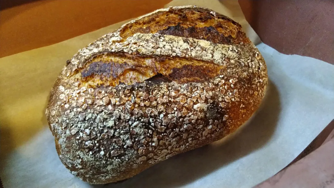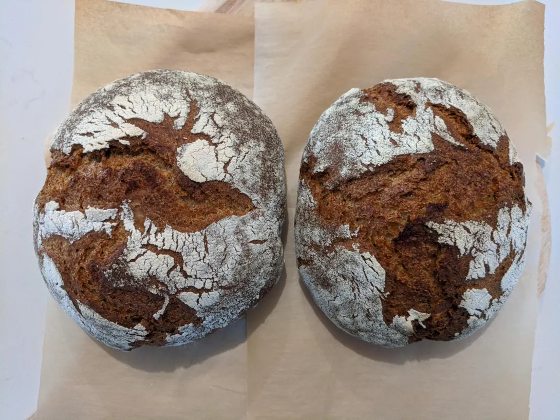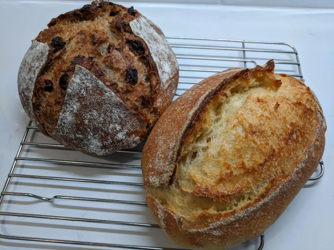 The first loaf is a 100% semolina sourdough and the second is a yeast water raisin and sunflower loaf, both at 75% hydration. Both loaves were mixed up at about the same time, fermented and baked together.