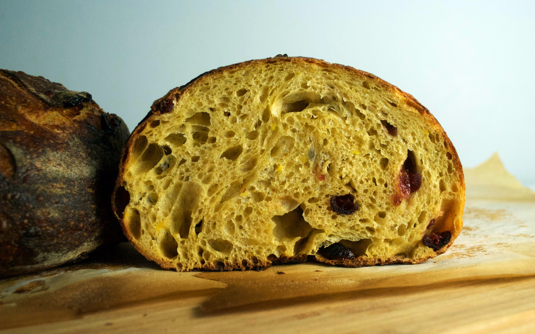 The sweet loaf used roasted butternut squash puree and dried cranberries (I would like to try it with the cherries; I just didn't have any on hand). I just love the color:
