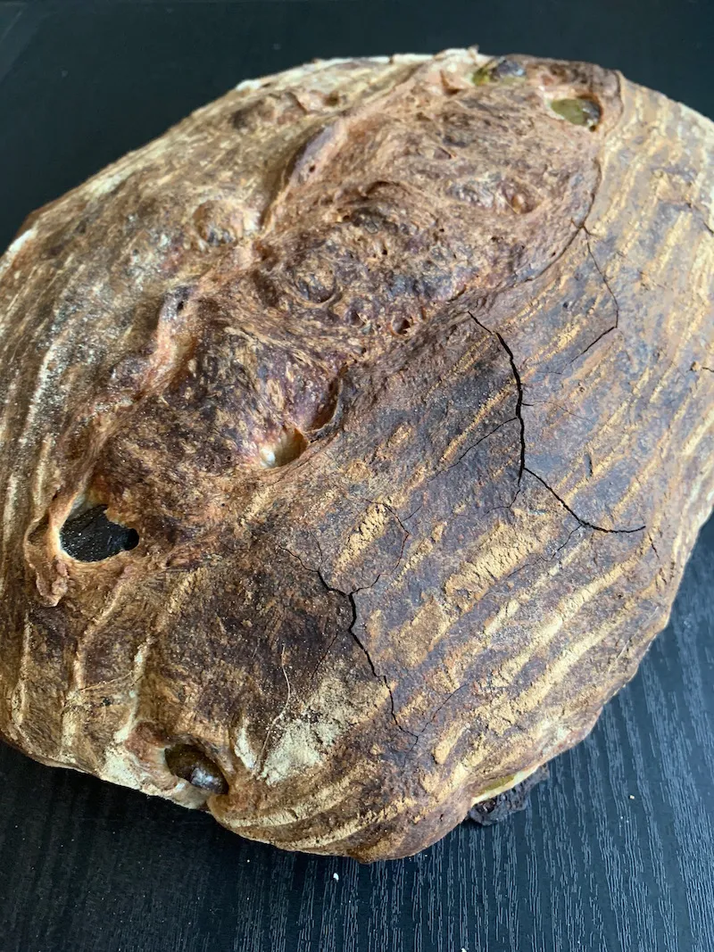 I have been dipping my toes into breads with added goodies recently. My favorite part of bread with goodies is biting into a slice and getting a little surprise of olives/raisins/nuts/ etc. I think it adds a nice textural variance to the bread. I haven't made a loaf with olives yet, so when I found this recipe in Hammelman's Bread and had to give it a try. The loaves are about 65% hydration, 20% olives, 10% whole wheat, and naturally leavened. I ended up making a fougasse and a batard. Please excuse the large chunk of fougasse missing here. I couldn't resist. :)